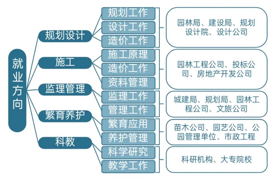 毕业生可在城乡建设、园林、林业、风景区、森林公园、国家公园、生态环境保护和生态文明建设等领域和部门从事园林植物繁育栽培、应用、养护管理及园林绿地规划、设计、施工、教育和科学研究等方面的工作。