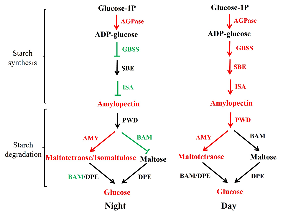 课题组前期在青萍重离子辐射诱变突变体库中筛选到一株高淀粉浮萍新品种,因其在拥挤或者寡营养条件下沉入水底,我们将其命名为沉水浮萍突变体sub-1。与野生型相比,突变体sub-1的支链比例增加11.08%,占总淀粉的84.04%。淀粉理化性质分析发现,突变体sub-1的淀粉分支度显著增加19.6%,支链淀粉链长DP 13-24显著增加。突变体sub-1淀粉结晶度只有8.94%,而野生型淀粉结晶度为22.3%。为了深入探究突变体sub-1高效积累支链淀粉的分子机制,我们进行了转录组和代谢组联合分析。结果发现,直链淀粉合成酶基因(GBSS1)和淀粉分支酶基因(SBE)差异表达是支链淀粉比例增加的重要原因。我们还发现,突变体sub-1淀粉降解为葡萄糖依赖于α-淀粉酶,而β-淀粉酶基因下调有利于淀粉的积累。本研究为利用合成生物学手段创制高支链淀粉作物种质资源提供理论指导。