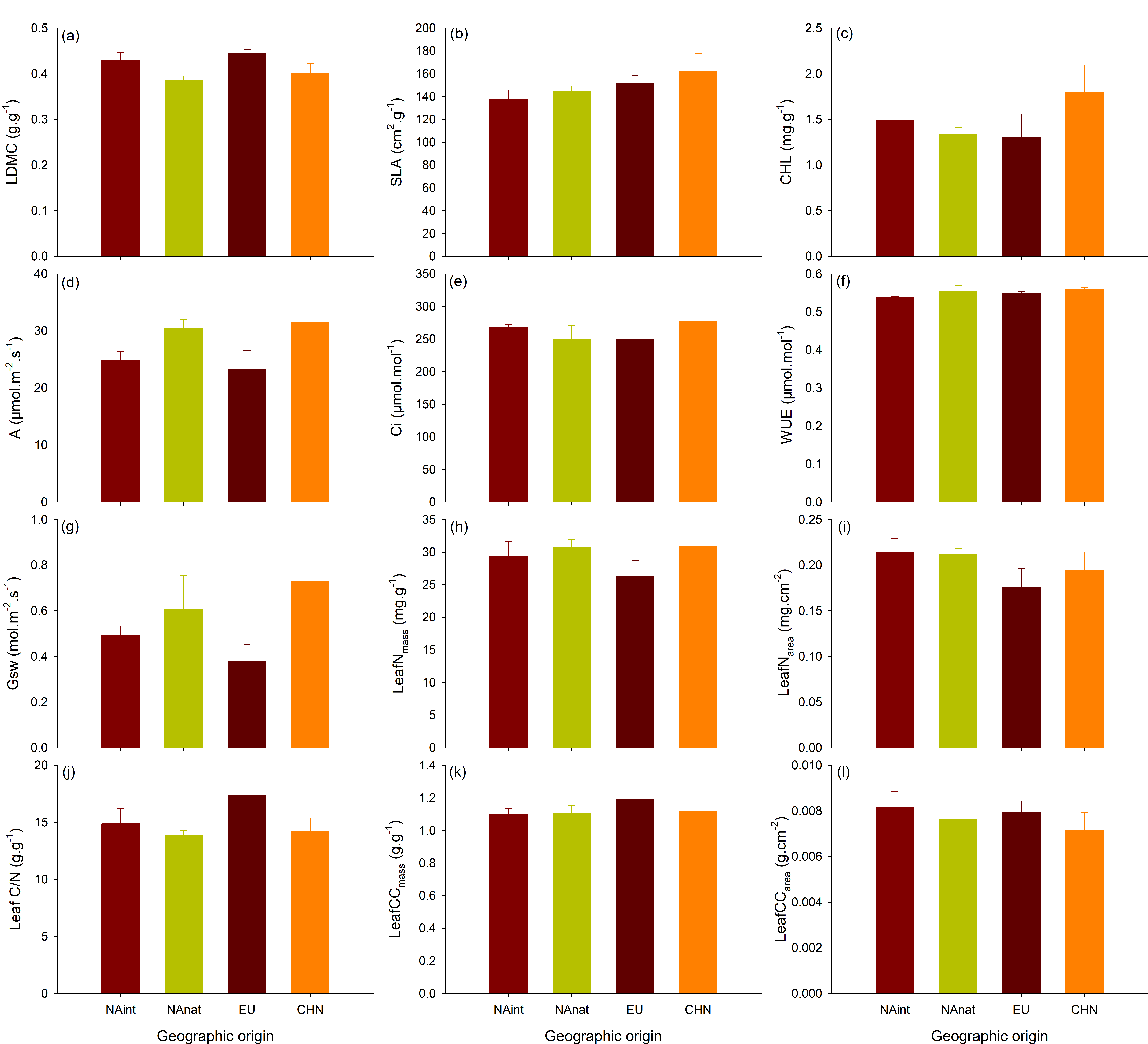图 1 不同芦苇地理类群叶功能性状比较
