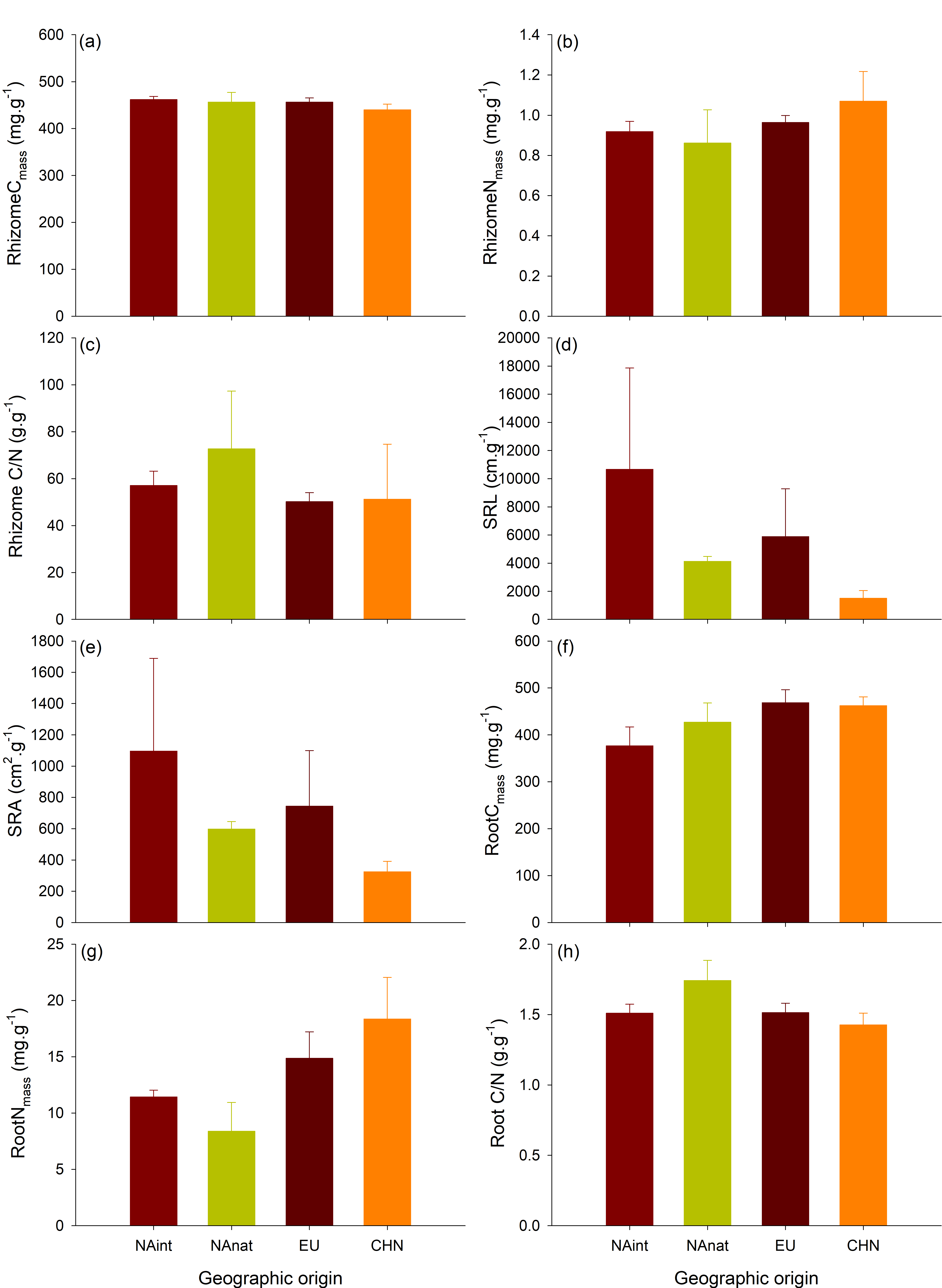 图2 不同芦苇地理类群地下部分功能性状比较