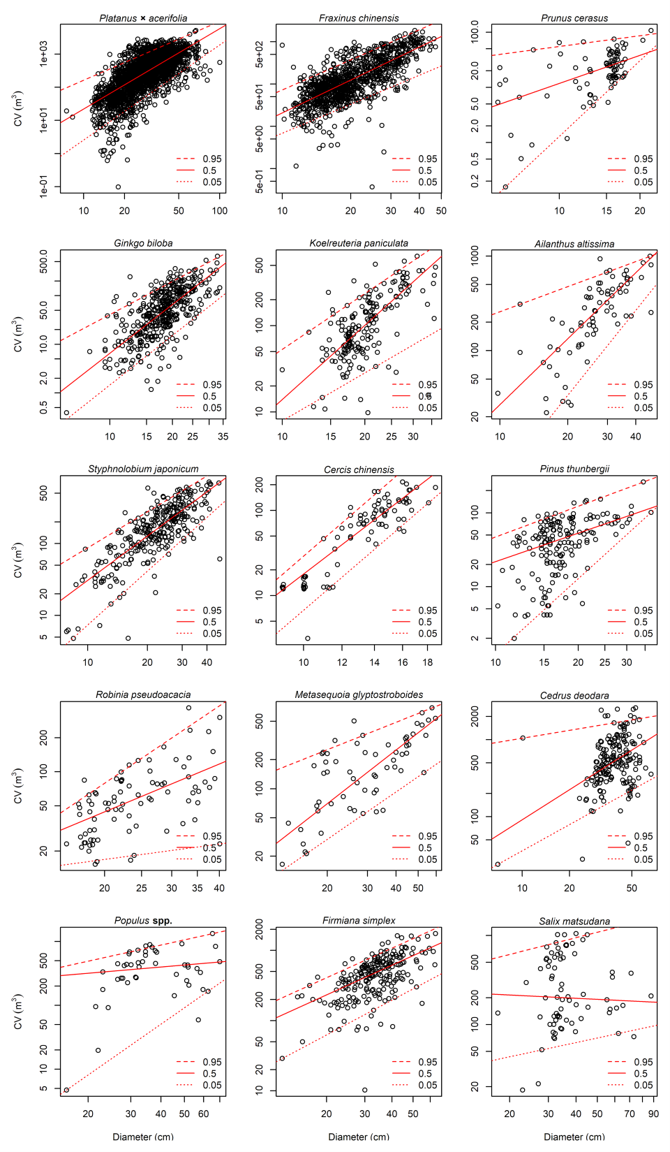 图3 青岛市15树种树冠体积-胸径异速关系的分位数回归(95%、50%和5%)拟合图