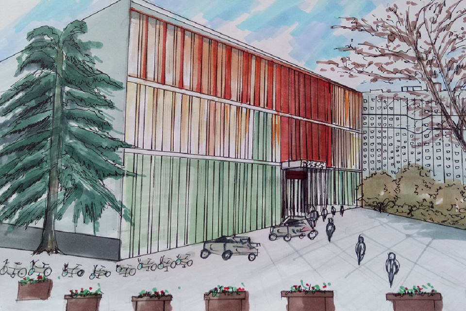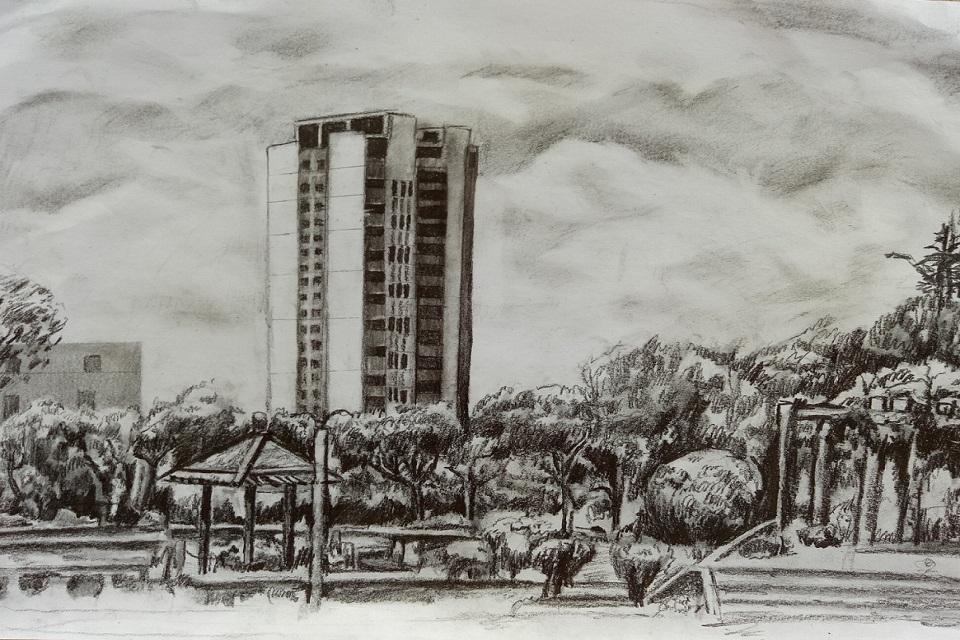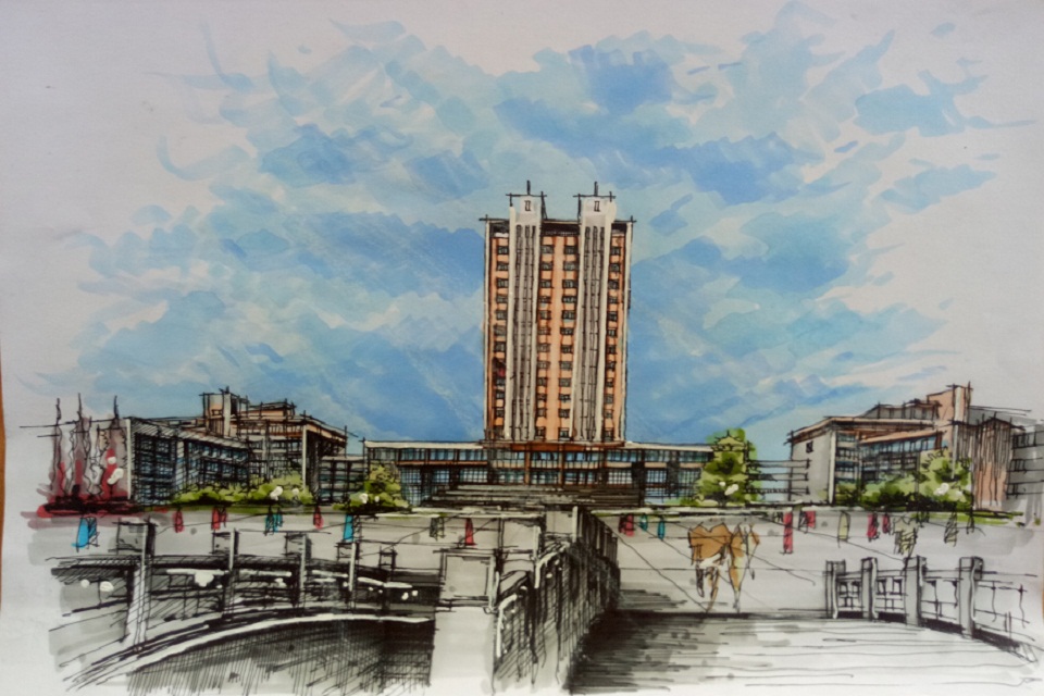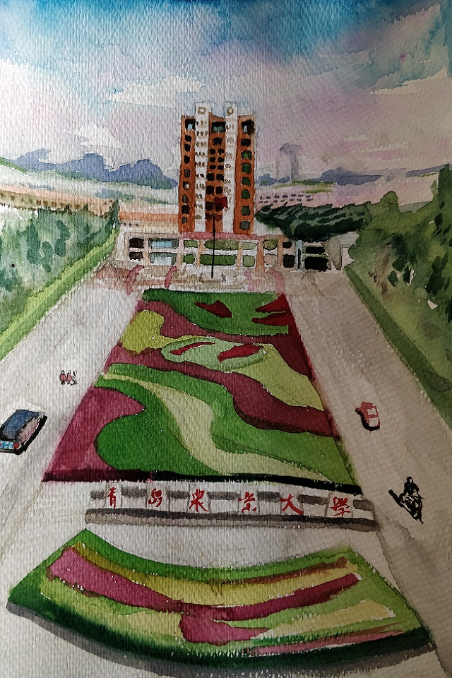 例如,曹智超手绘的《主楼下的虹子广场》中的主楼与虹子广场一高一平、一窄一阔形成了鲜明的对比,将主楼的宏伟与虹子广场的广阔刻画的淋漓尽致。