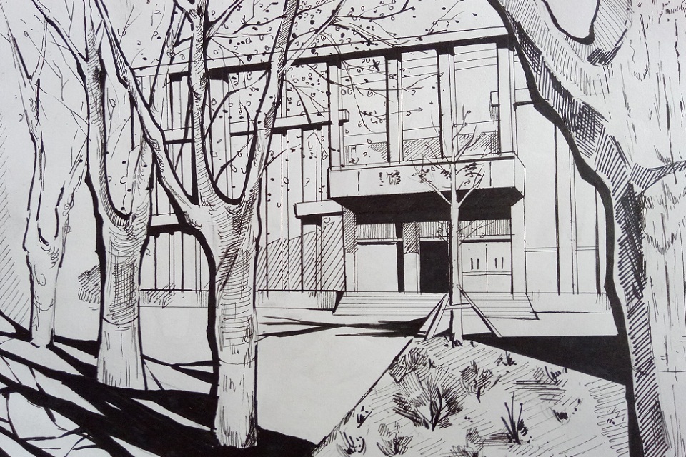 还有李致峰的《学术会馆》,用无数线条将学术会馆的明暗变化以及道旁的大树描绘得栩栩如生……