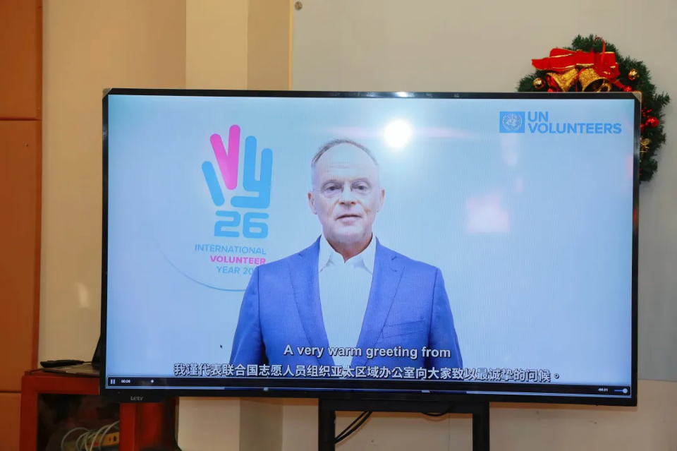 联合国志愿人员组织亚太区域主任克里斯蒂安·哈因茨尔(Christian Hainzl)视频致辞,视频中,他肯定了此次活动对推动志愿服务跨界融合的积极意义;回顾了多方合作成果,展望了志愿服务与可持续发展目标深度融合的未来方向。现场,来自宋庆龄青少中心的青少年代表、大学生志愿者代表、银龄志愿者代表、教师志愿者代表,以及联合国项目志愿者代表通过多元视角对话依次分享了实践感悟。