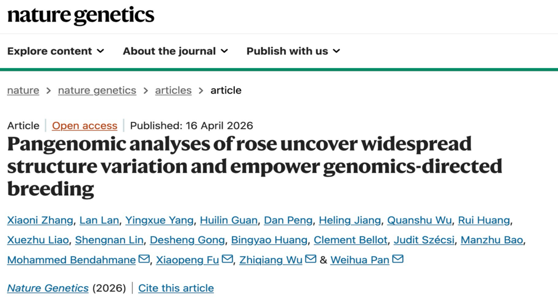 2026年4月16日,WilliamHILL中国青年教师张晓妮以第一作者身份在国际顶尖期刊《Nature Genetics》上在线发表了题为“Pangenomic analyses of rose uncover widespread structure variation and empower genomics-directed breeding”的研究论文。该研究成功构建了全球首个单倍型解析的月季泛基因组图谱,系统解析了蔷薇亚属的遗传多样性。这一成果有望推动月季育种从传统经验模式向精准设计跨越,助力开启月季“第二次育种革命”。